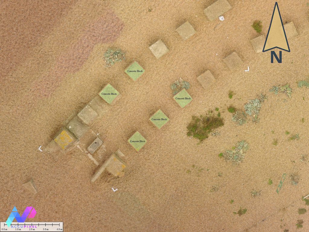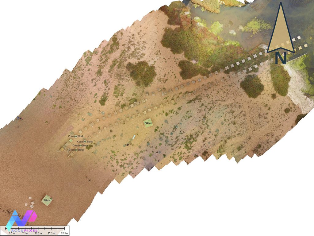 Surveying dynamic and stable environments can be a perplexing task for a photogrammetrist. The military heritage of Dorset beach offers the chance to explore how to survey a site with varying terrains and conditions. Historically, Chesil served as the training and preparation grounds for the then pending invasion of Normandy. Located in the Southeastern coast of the the UK, the beach Chesil bears the relics of the Second Great War. Two long lines of sparsely spaced concrete barriers loom across pebble laden beach. Nicknamed “Chesil’s Dragon Teeth” due to their barrier rows resemblance, the site is a silent reminder of wartime efforts. The brutish rows of concrete blocks can be seen today. These anti-tank barriers, a deterrence for a German naval invasion, extend from the water’s edge over the beach and down to the Fleet, a natural barrier of water.